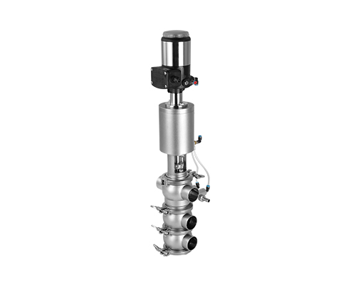 E-C系列防混閥主要由執(zhí)行機(jī)構(gòu)、連接支架、閥桿、閥體組成,閥桿通過執(zhí)行器機(jī)構(gòu)驅(qū)動(dòng)做軸向直線運(yùn)動(dòng),閥桿向上運(yùn)動(dòng)時(shí),上下管路通道開啟;閥桿向下運(yùn)動(dòng)時(shí),通道關(guān)閉。閥桿上設(shè)計(jì)有兩道密封圈與閥體密封面形成獨(dú)立的密封腔,與CIP閥相通,可用于密封檢漏;或上下管路流通不同介質(zhì)時(shí)起到防混監(jiān)測的作用。